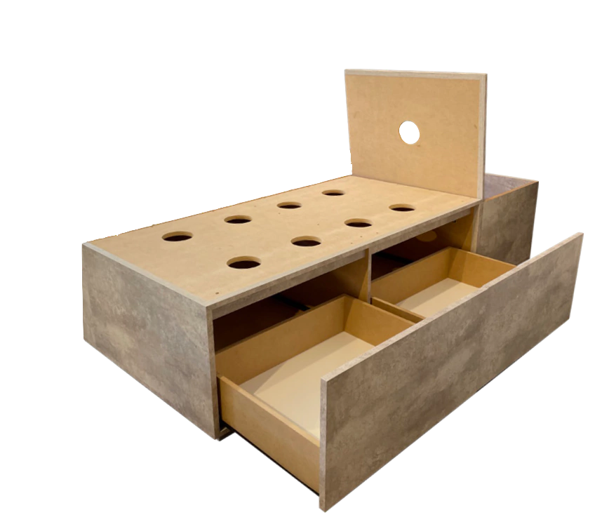 Este sommier cuenta con 2 cajones espaciosos (0,64 x 0,50 x 0,14 m cada uno), ideales para mantener tu espacio ordenado y aprovechar cada rincón. Además, incorpora 1 baulera en la cabecera (0,90 x 0,50 x 0,37 m), perfecta para guardar tus objetos personales al alcance de la mano.