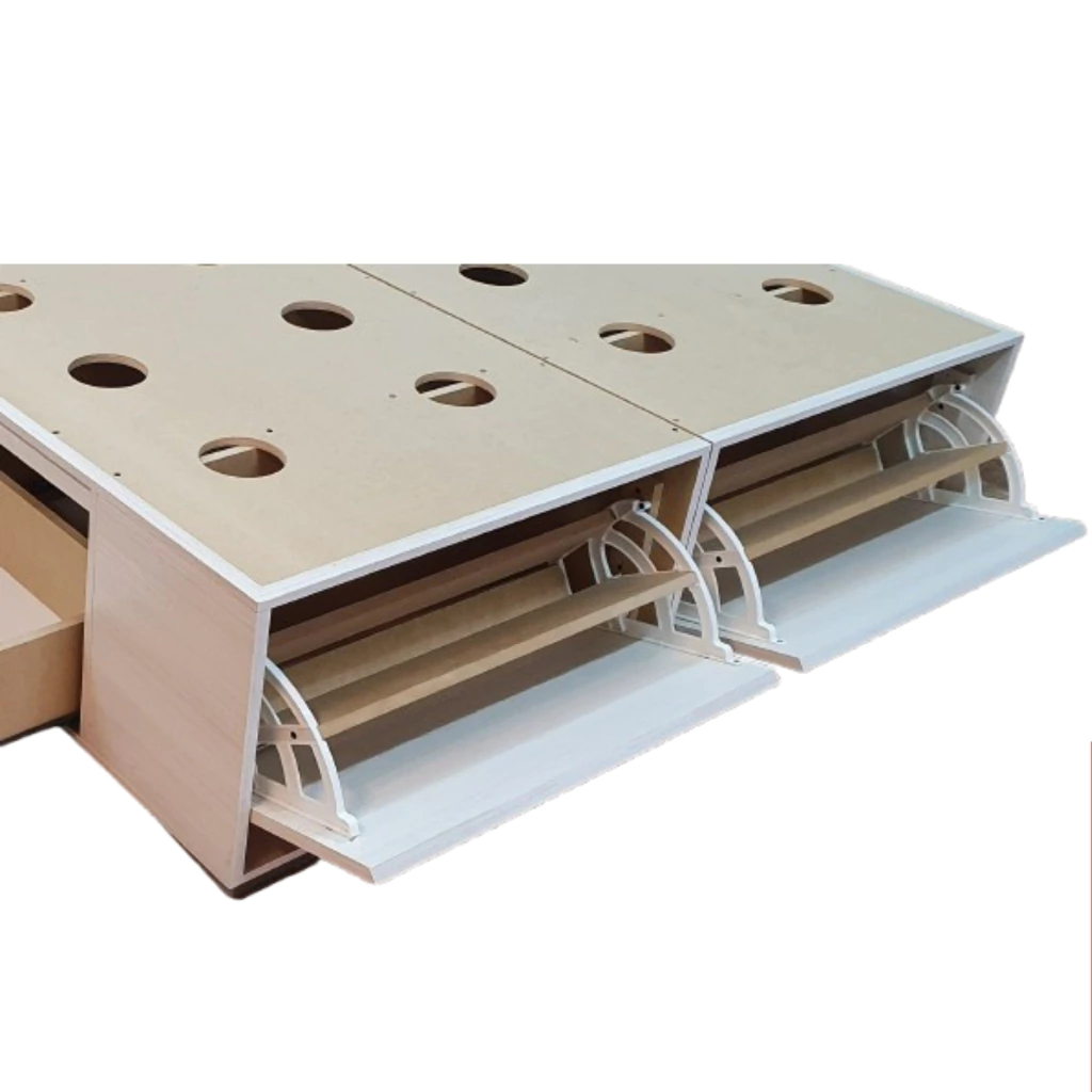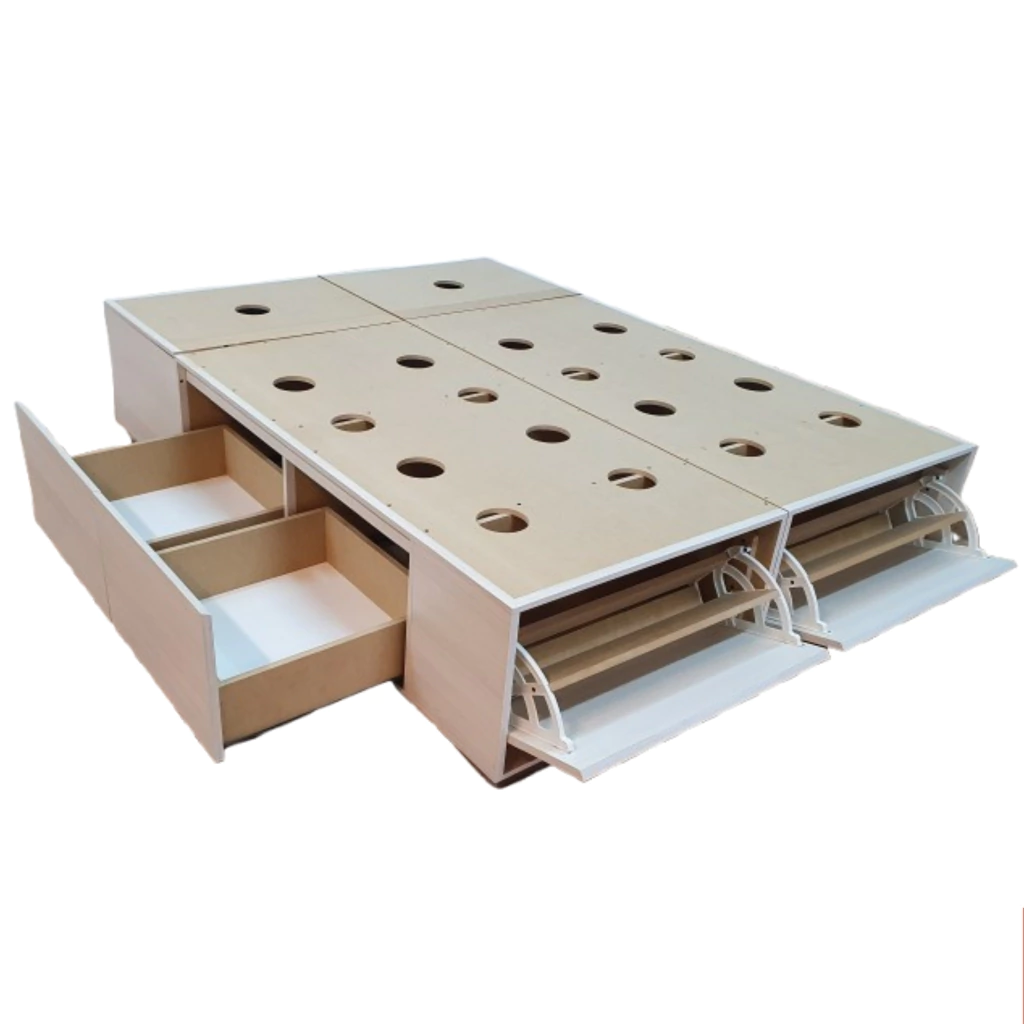 Este sommier cuenta con 2 box laterales, cada uno con 4 cajones (incluyendo cajones nido), un baúl en la cabecera y un zapatero integrado, ideales para mantener tu habitación ordenada y elegante. Las patas de pino macizo, reforzadas con acero inoxidable en las esquinas, aseguran estabilidad y un toque sofisticado.